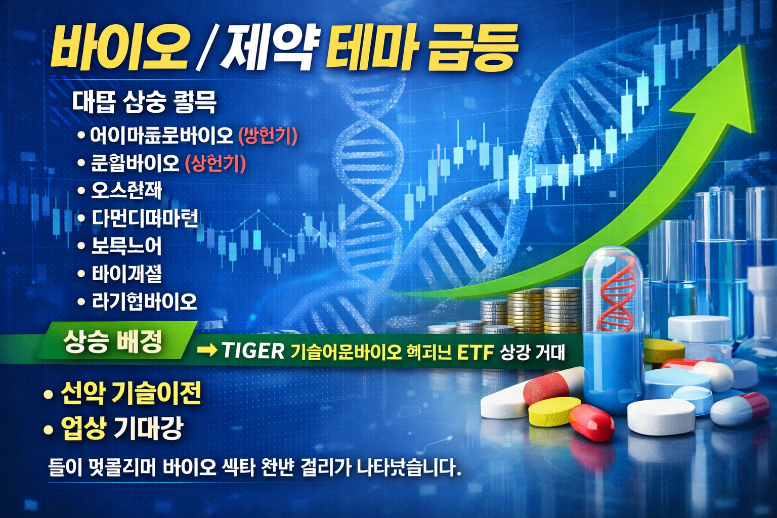 특히 오늘 시장은 AI·바이오·에너지 정책 관련 테마 장세가 매우 강하게 나타난 것이 특징입니다.