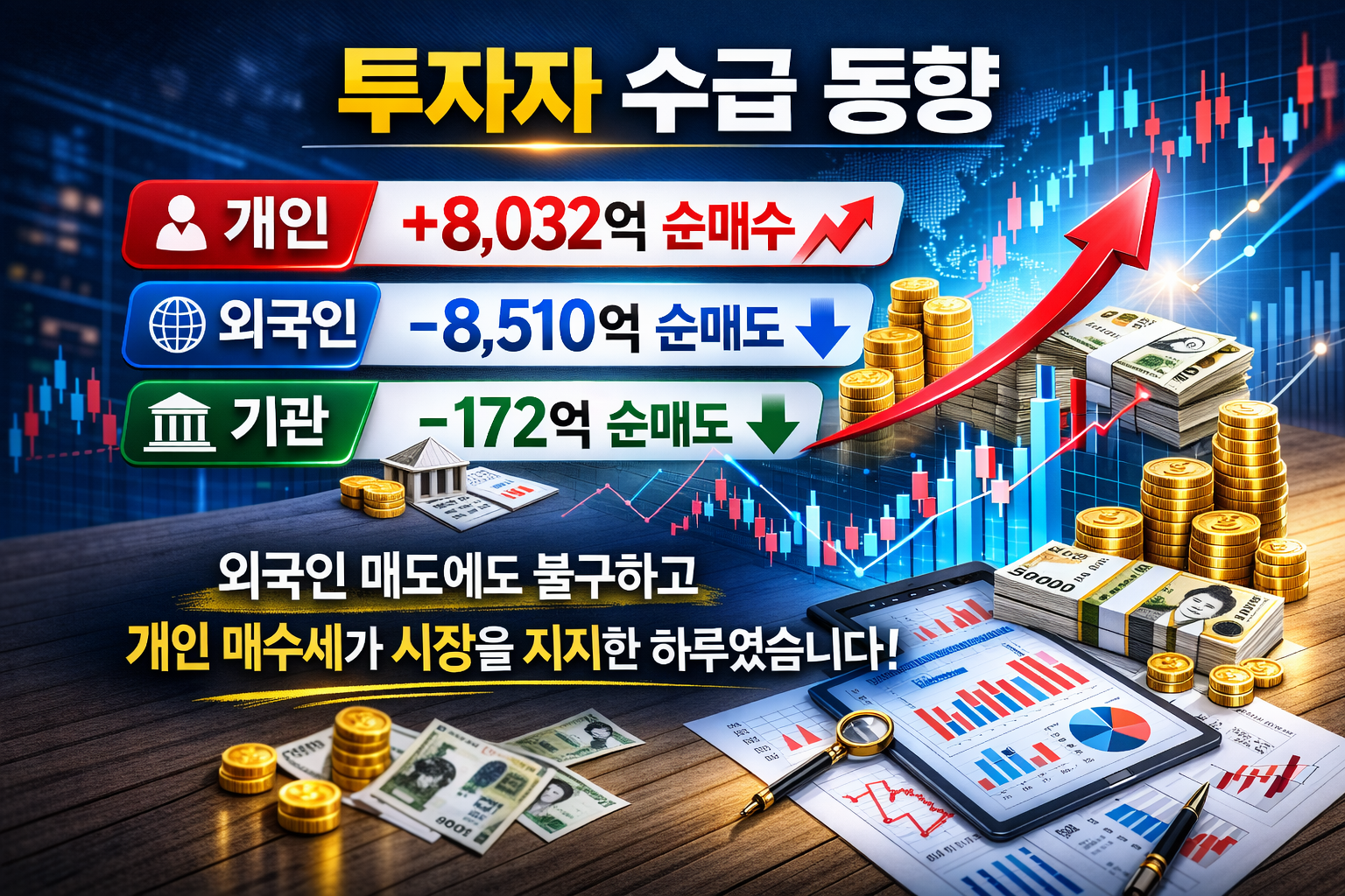 외국인 매도에도 불구하고 개인 매수세가 시장을 지지한 하루였습니다.