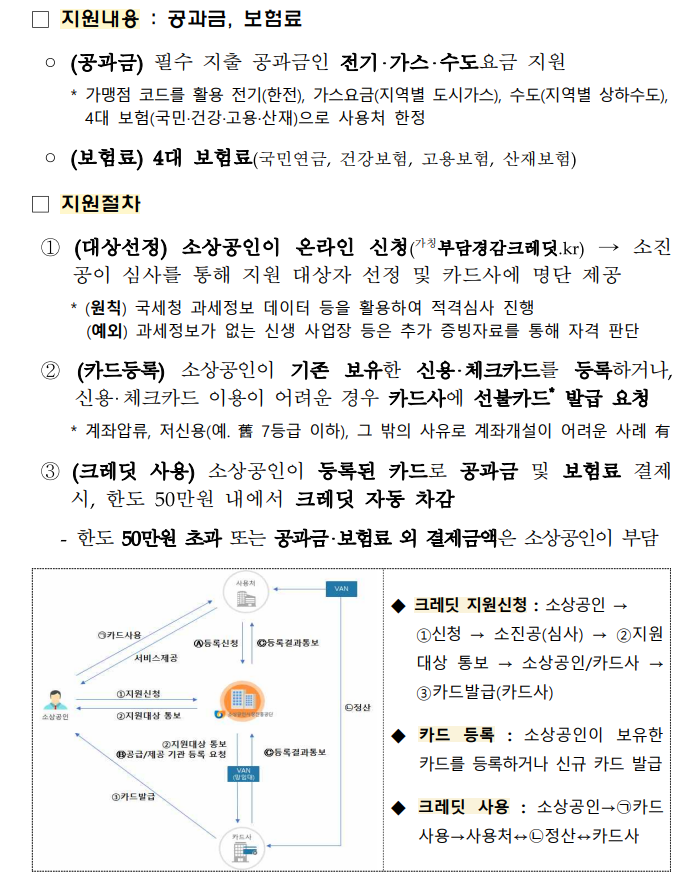 | 부담경감 크레딧 | 연매출 3억 이하 소상공인 | 공과금 및 4대보험 50만 원 지원 | 7.14 ~ 11.28 | 부담경감크레딧.kr / 1533-0600 |