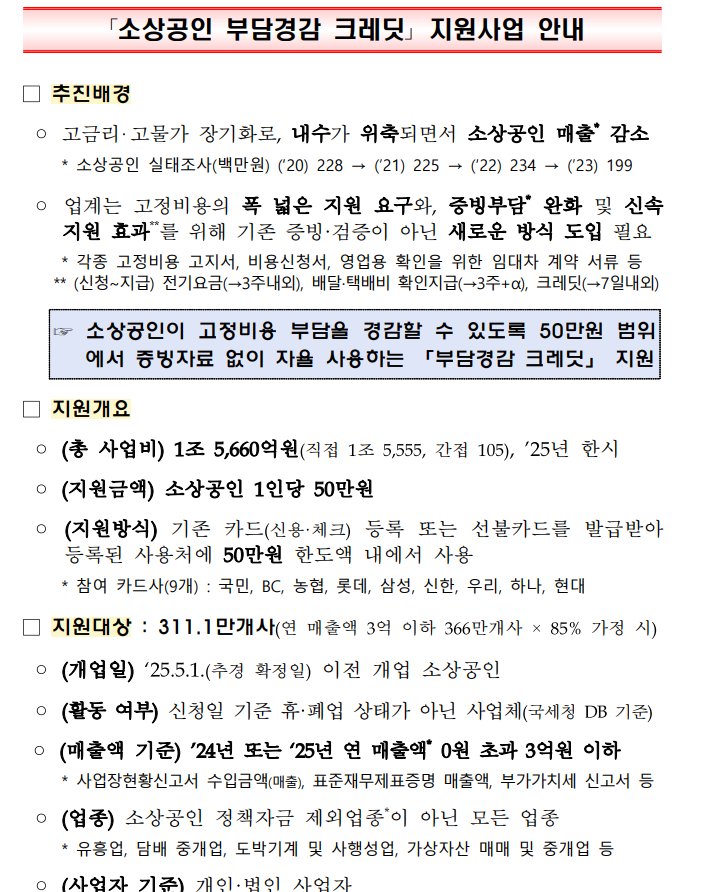 | 부담경감 크레딧 | 연매출 3억 이하 소상공인 | 공과금 및 4대보험 50만 원 지원 | 7.14 ~ 11.28 | 부담경감크레딧.kr / 1533-0600 |