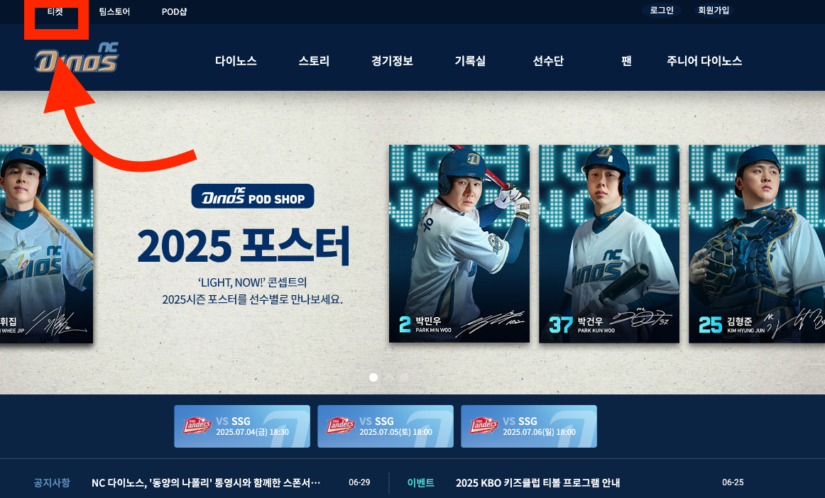 - PC: [NC 다이노스 공식 홈페이지]에서 로그인 후 티켓 예매 메뉴 이용