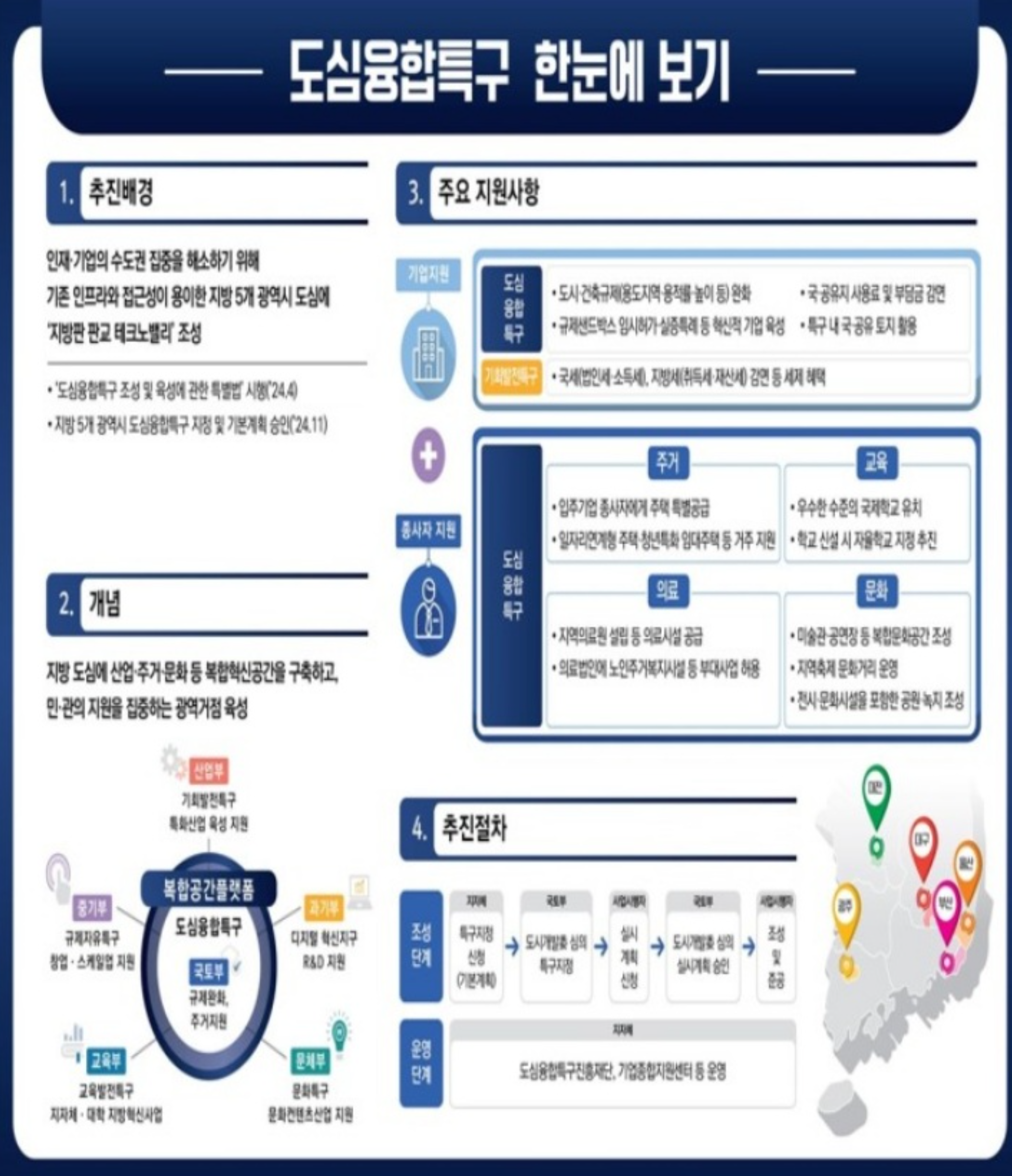 도심융합특구는 지방 대도시 도심에 산업·주거·문화·교육·의료 기능을 한 곳에 집약한 복합 혁신 거점입니다.
