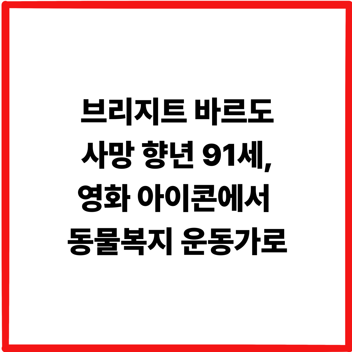 프랑스를 대표하는 전설적 배우 브리지트 바르도가 향년 91세로 별세했다. 1950~1960년대 세계 영화계를 풍미한 그는 은퇴 이후 동물복지 운동가로 전향해 전혀 다른 삶의 궤적을 남겼다.