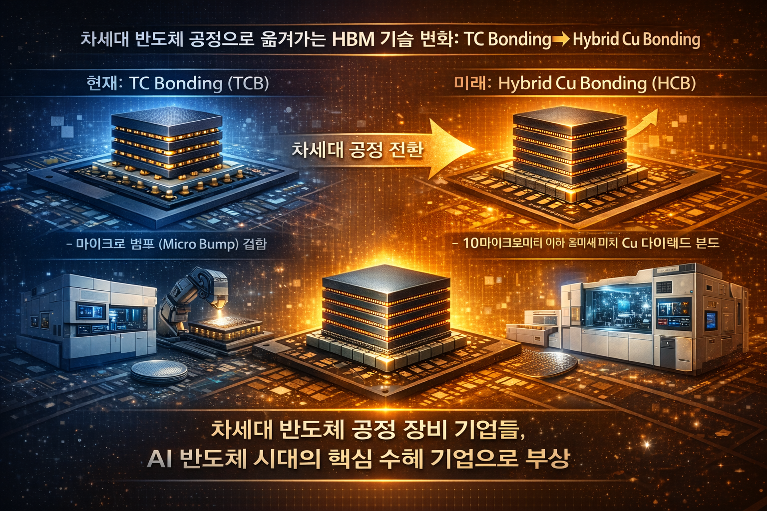 AI 반도체 시대가 열리면서 HBM(고대역폭 메모리) 중심의 반도체 장비 산업이 빠르게 성장하고 있습니다. 특히 SK하이닉스와 삼성전자가 차세대 HBM 생산 확대에 나서면서 TC 본더와 HCB(Hybrid Cu Bonding) 장비 시장이 새로운 성장 산업으로 떠오르고 있습니다.